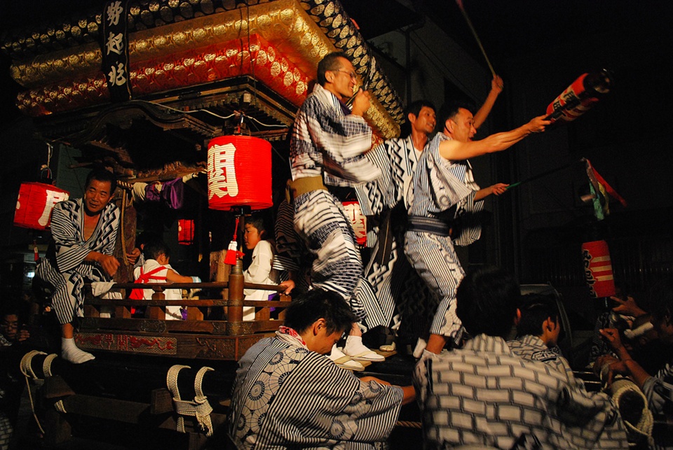 待ちに待った祭り本番。初日は渡守神社から当番町へ神輿の渡御,二日目は当番町で御旅所祭,最終日には当番町から神社へ還御祭が行われます。還御祭が終わると,いよいよチョウサイの登場!豪華なチョウサイは太鼓と囃子役の音頭で町内を引き廻され,町中が夜まで活気に包まれます。