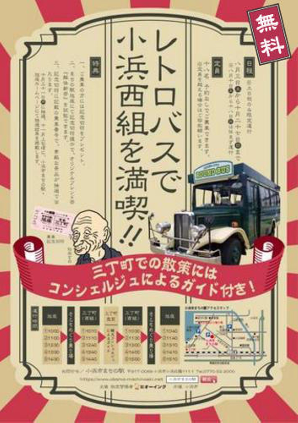 小浜の港町散策の拠点となる芝居小屋旭座がある小浜市まちの駅からは、毎週土日と祝日に限り、レトロバスが運行しています。