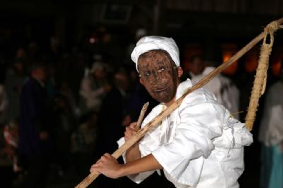 奇怪なケベスも混えて境内を行列し、やがて境内の一隅に積まれた「シダ」に火が付けられます。