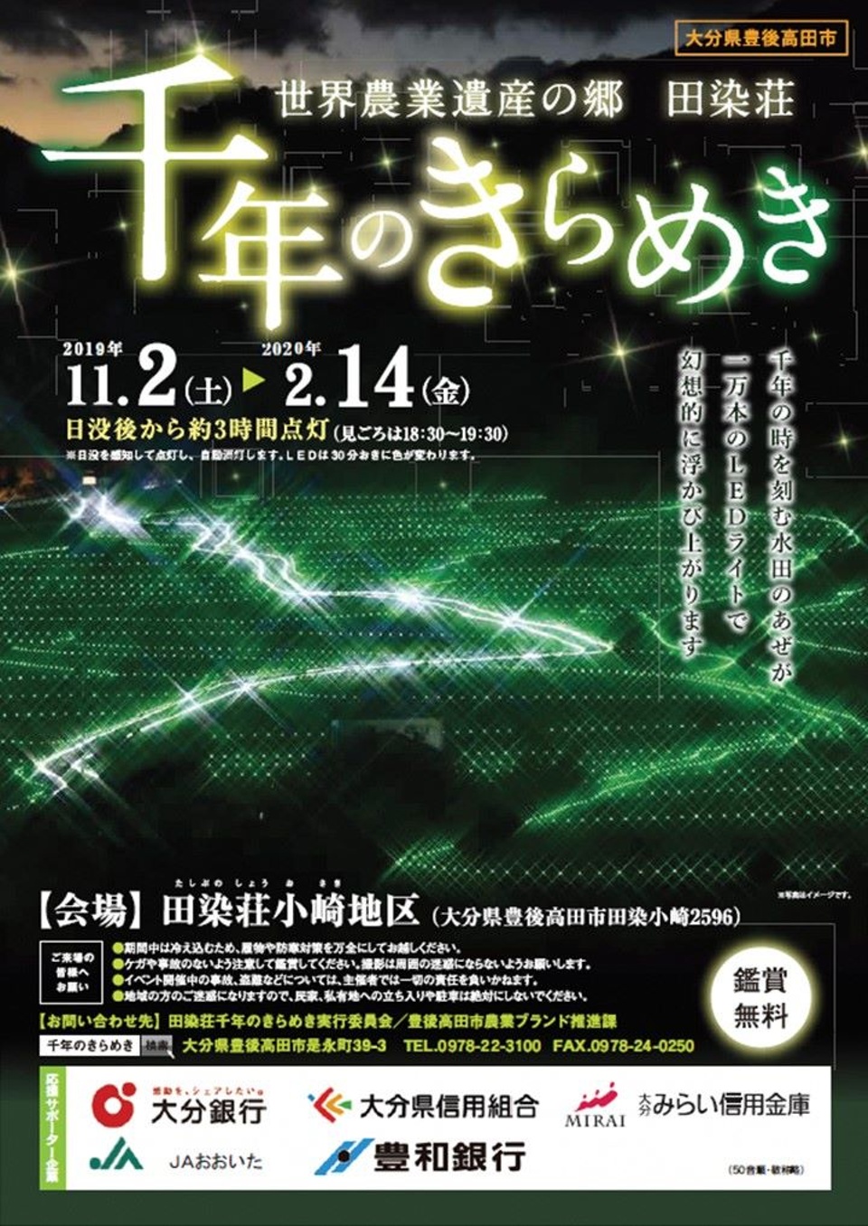 田染荘小崎の水田の畦道に設置された約1万個のLEDライトが、日没とともに点灯していき、暗闇の中を彩っていきます。また、初日の11月2日はオープニングイベントもあります。