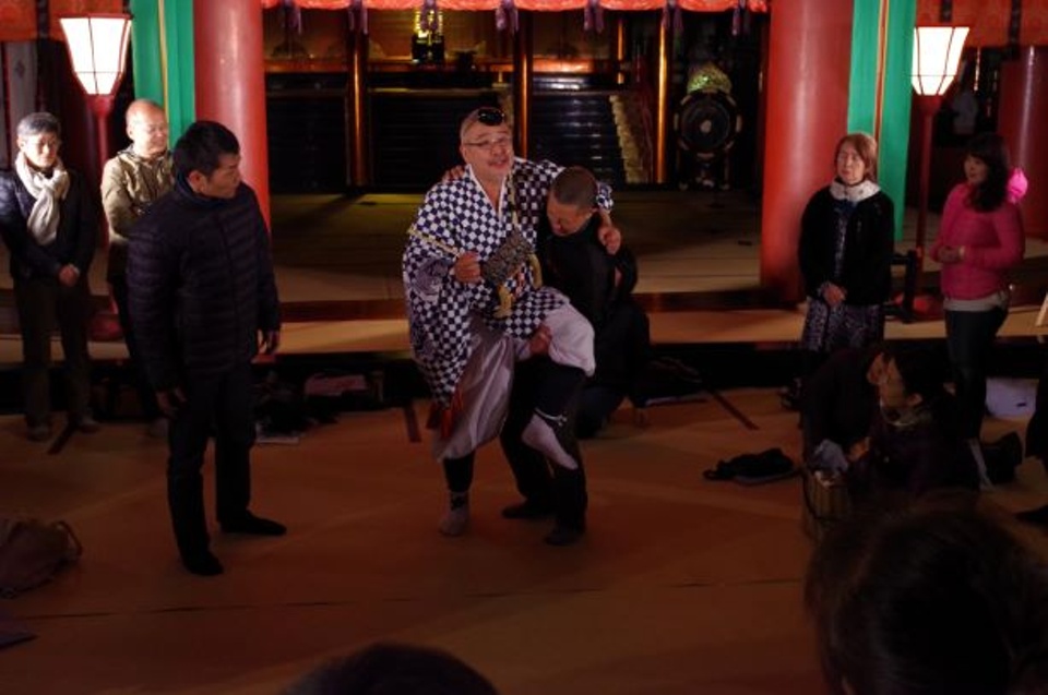 体験コーナーでは、参加者一体となって祝詞の一部や能の謡の発声や神社の禰宜からおそわる山伏修行「鎮魂の行」ということで心の整え方を学びました。山伏の方からは二人組になり、修験道から発想した心と体の使い方などを学びました。すがすがしい気持ちの時は、体に力がしっかり入るとのこと!