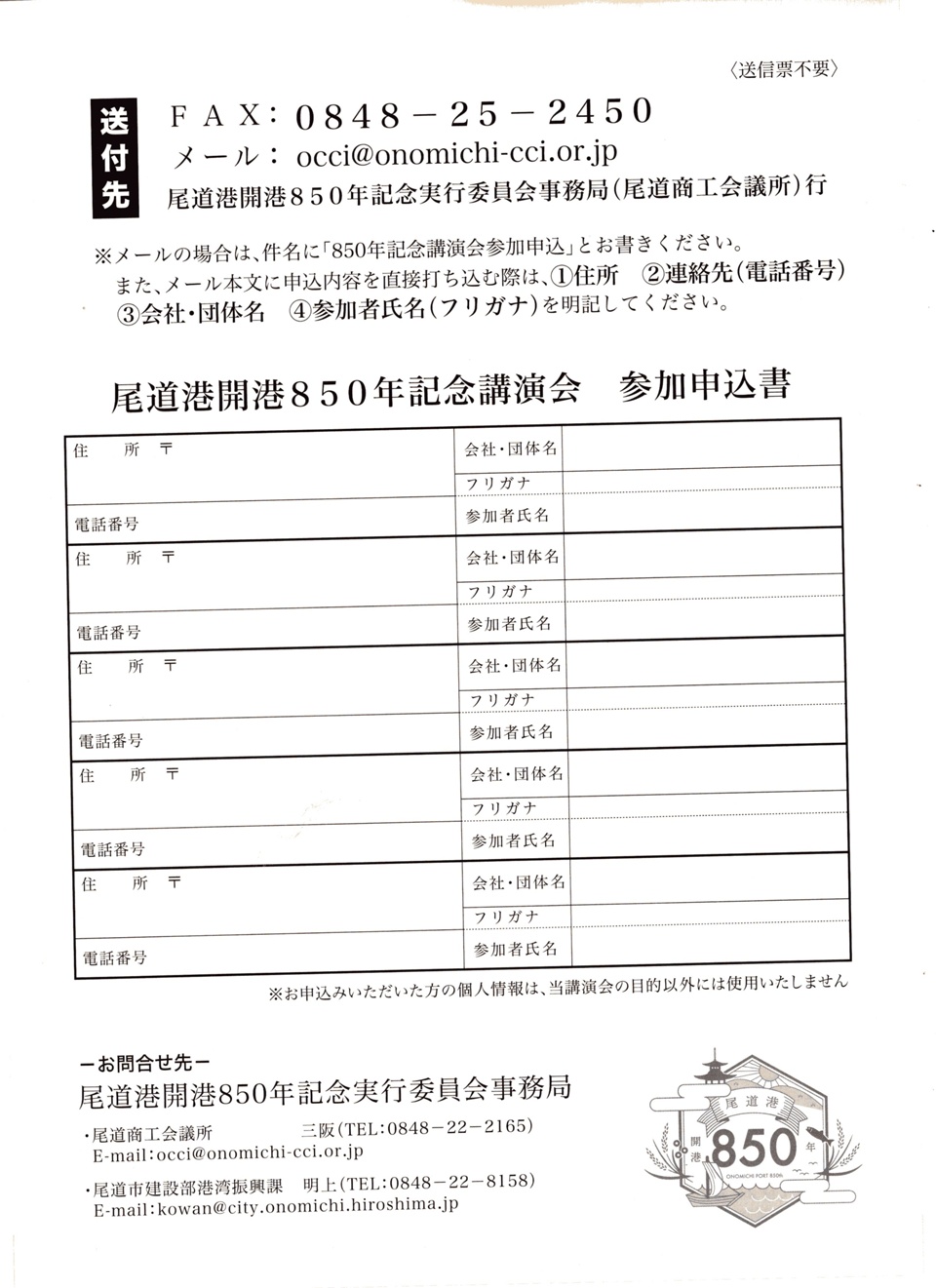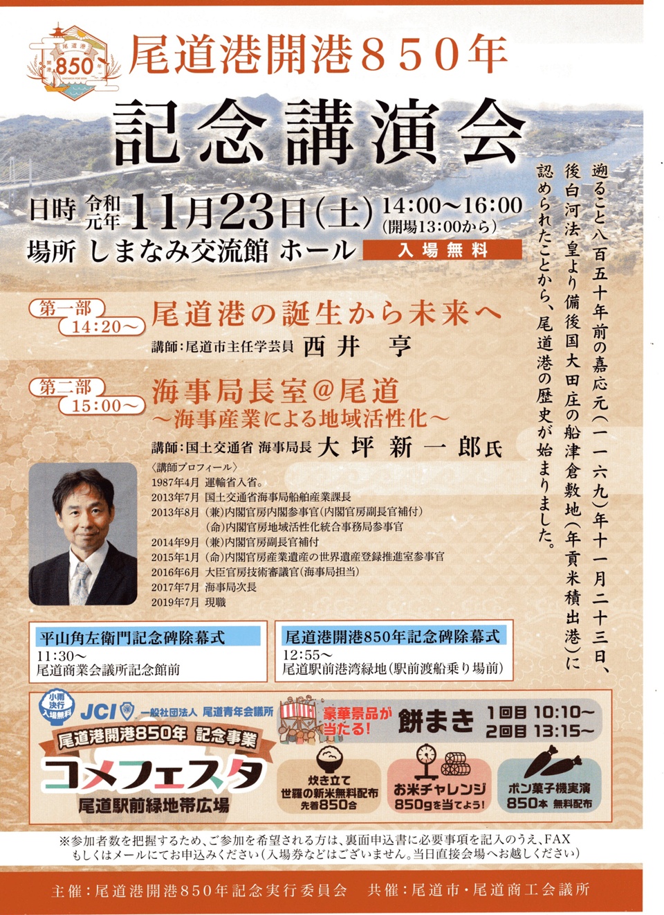 平安時代の嘉応元年(1169)に荘園の倉敷地に公認されて以来、850年の歴史をもつ港町尾道の歴史や海事産業による地域活性化などについての講演会です。同じくコメフェスタも開催されます。ぜひご来場ください。
