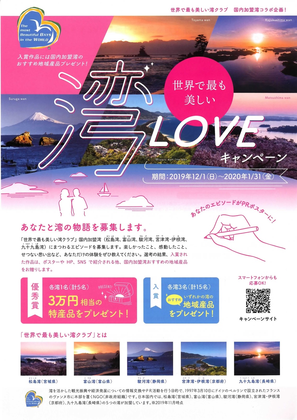 「世界で最も美しい湾クラブ」国内加盟湾(松島湾、富山湾、駿河湾、宮津湾・伊根湾、九十九島湾)にまつわるエピソードを募集します。