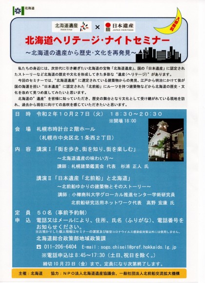 北海道の遺産から歴史・文化を再発見する「北海道ヘリテージ・ナイトセミナー」を開催します。