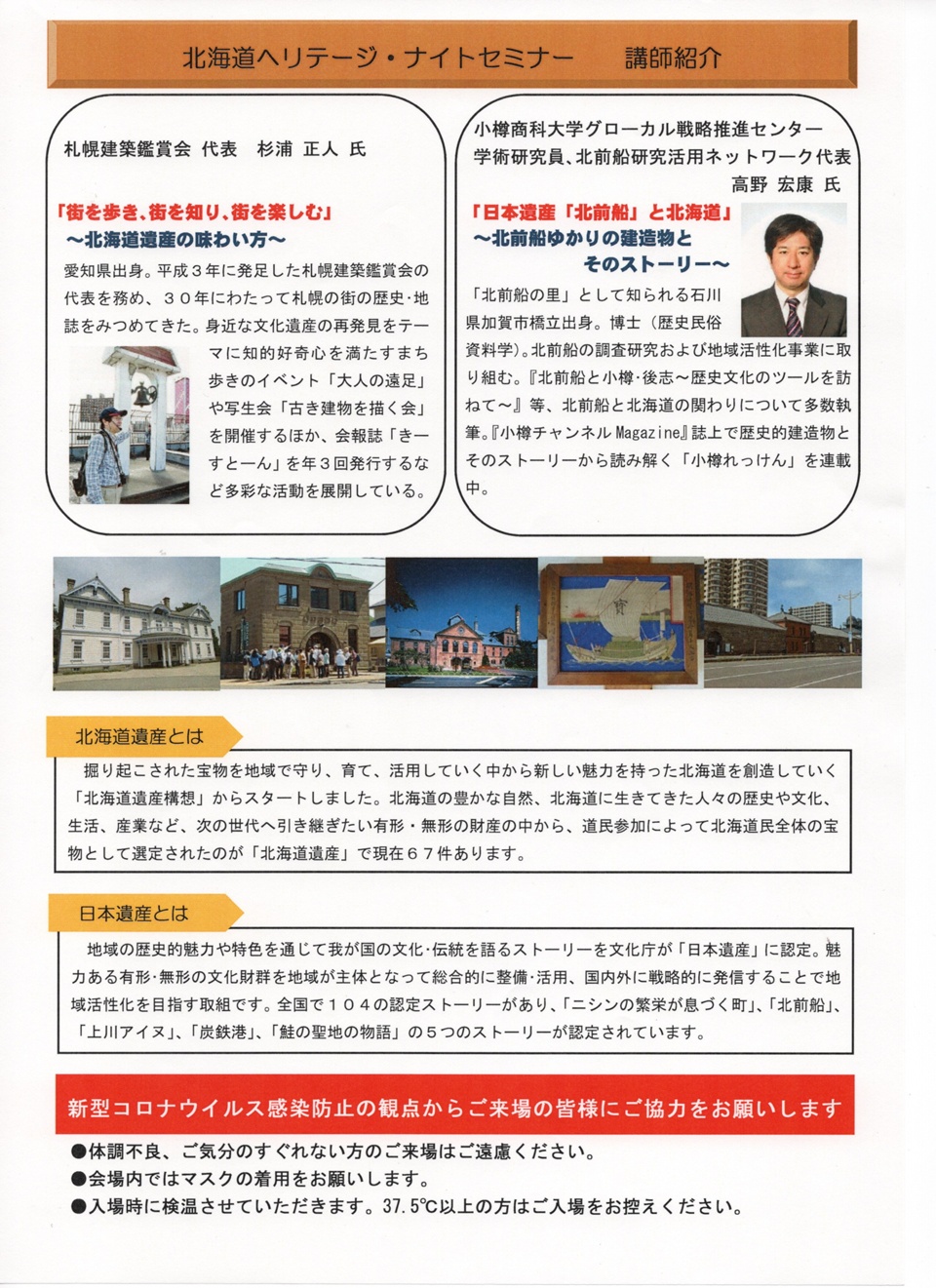 今回のセミナーは、北海道遺産に選定されている建築物からの発見、江戸から明治にかけて我が国の海運を担い北海道に大きな影響を与えた北前船にルーツを持つ建築物などから、北海道の歴史・文化を再発見する内容となっています。