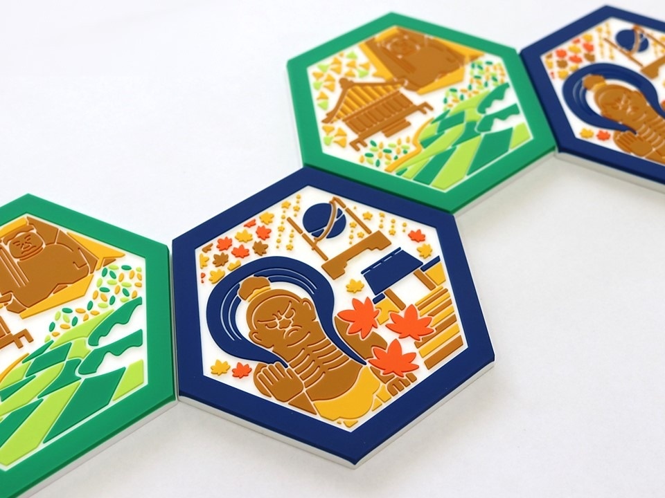 今回、更なるエンブレムの活用として、ラバーコースターを制作しました。第1弾は田染荘と両子谷のエンブレムを制作、徐々にラインナップを増やしていく計画です。