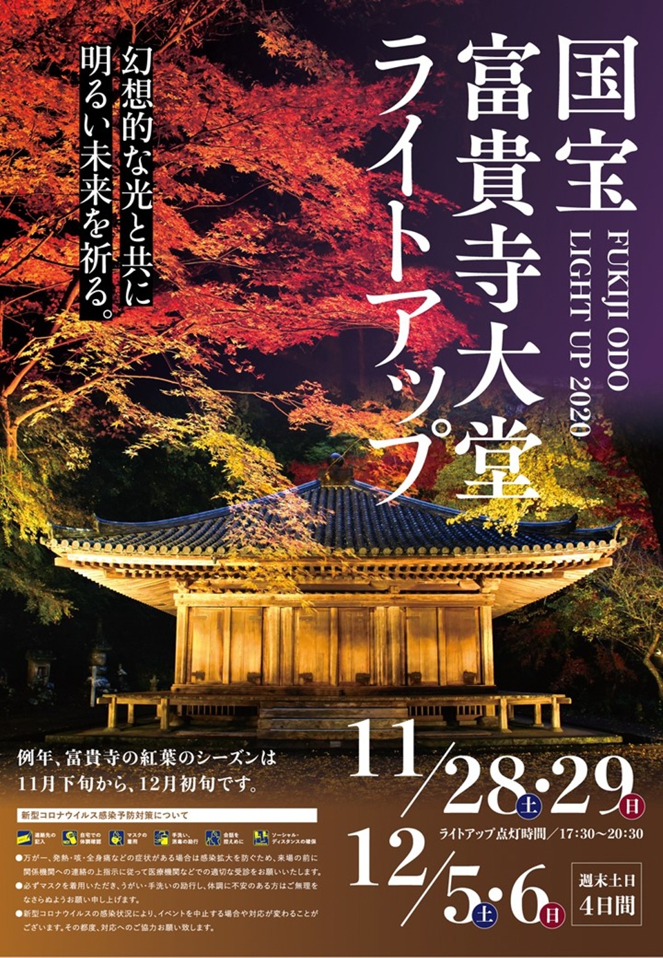 富貴寺での紅葉の見頃は11月下旬から12月上旬の予定です。この期間だけの、富貴寺と紅葉のライトアップなので、是非足をお運びください!