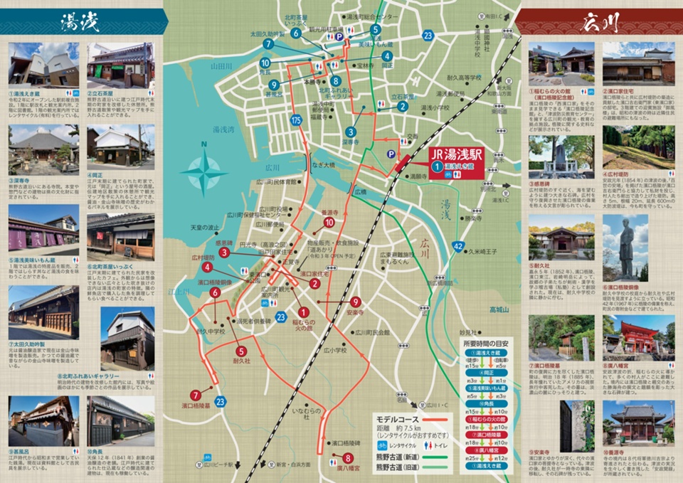 今回のマップでは、2つの日本遺産ストーリーだけではなく、JR湯浅駅を中心にそれぞれの構成文化財を歩いて回れる約7.5㌔のモデルコースを主要な観光スポットの写真付きで掲載されています。