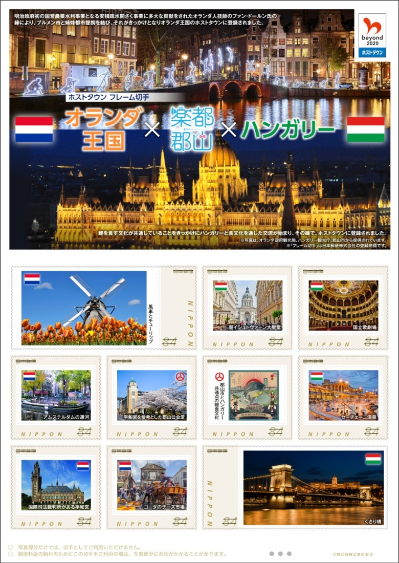 オランダ及びハンガリーのホストタウンに登録されていることを記念したフレーム切手「ホストタウン切手オランダ王国×楽都郡山×ハンガリー」が販売されています。