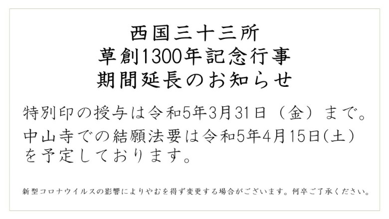 西国三十三所草創1300年記念行事を令和5年3月31日(金)まで延長いたします。