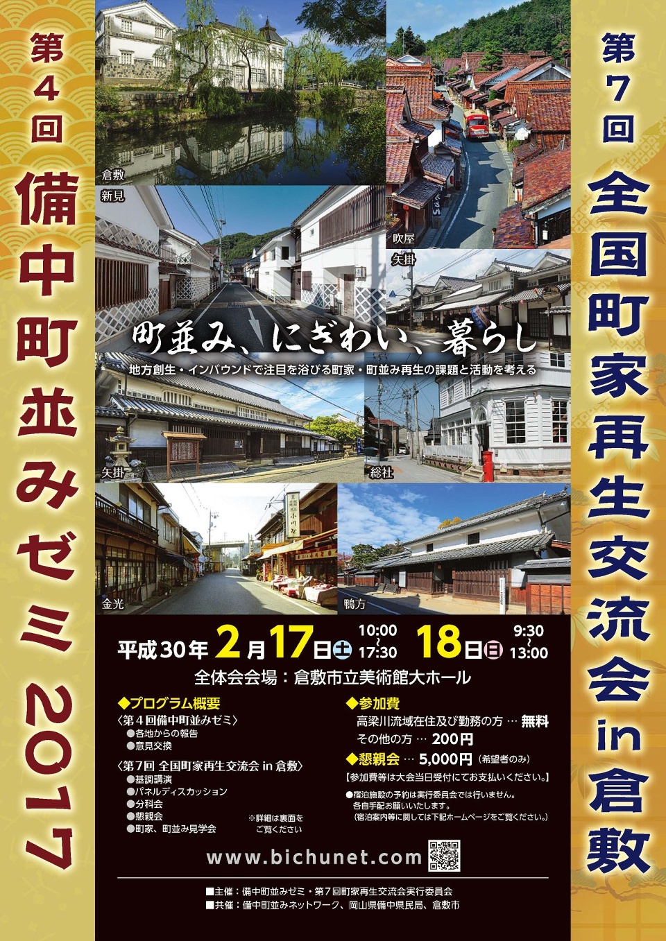 「町並み、にぎわい、暮らし」をテーマに、備中地域で毎年開催されている「備中町並みゼミ」と、2年毎に全国で開催されている「全国町家再生交流会」が、2月17日・18日に倉敷市で開催されます。