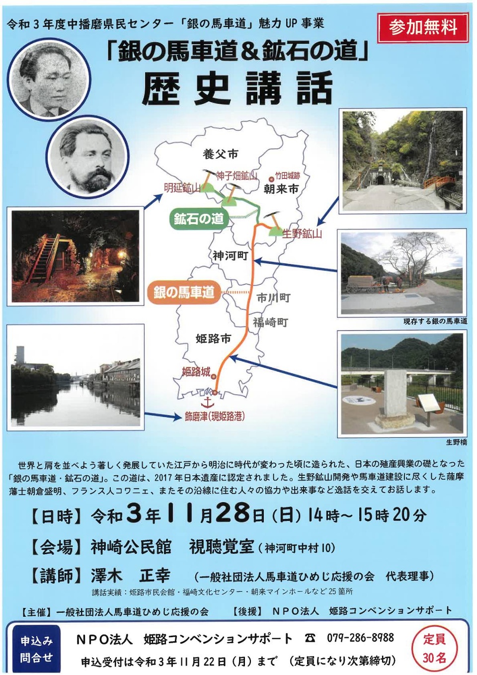 世界と肩を並べよう著しく発展していた江戸から明治に時代が変わった頃に造られた、日本の殖産興業の礎となった「銀の馬車道・鉱石の道」。この道は、2017年日本遺産に認定されました。生野鉱山開発や馬車道建設に尽くした薩摩藩士朝倉盛明、フランス人コワニェ、またその沿線に住み人々の協力や出来事など逸話を交えてお話しします。
