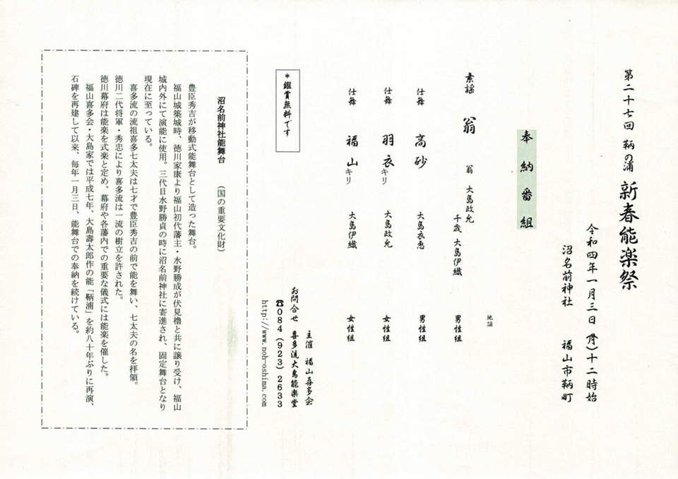 鞆の浦では、毎年1月3日に沼名前神社の能舞台での奉納があります。
