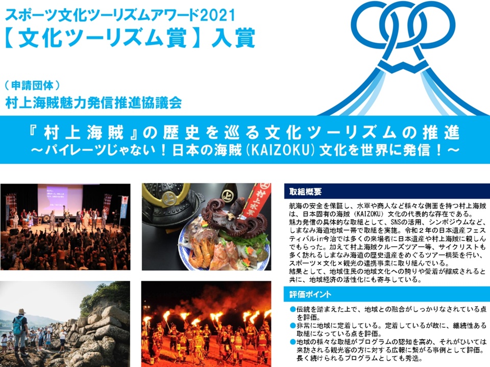 スポーツ庁、文化庁および観光庁がスポーツ、文化、観光を組み合わせた優れた取組を表彰するスポーツ文化ツーリズムアワード2021において、村上海賊魅力発信推進協議会(愛媛県今治市と広島県尾道市で構成)の『「村上海賊」の歴史を巡る文化ツーリズムの推進 ~パイレーツじゃない!日本の海賊(KAIZOKU)文化を世界に発信!~』の取組が「文化ツーリズム賞」を受賞しました。