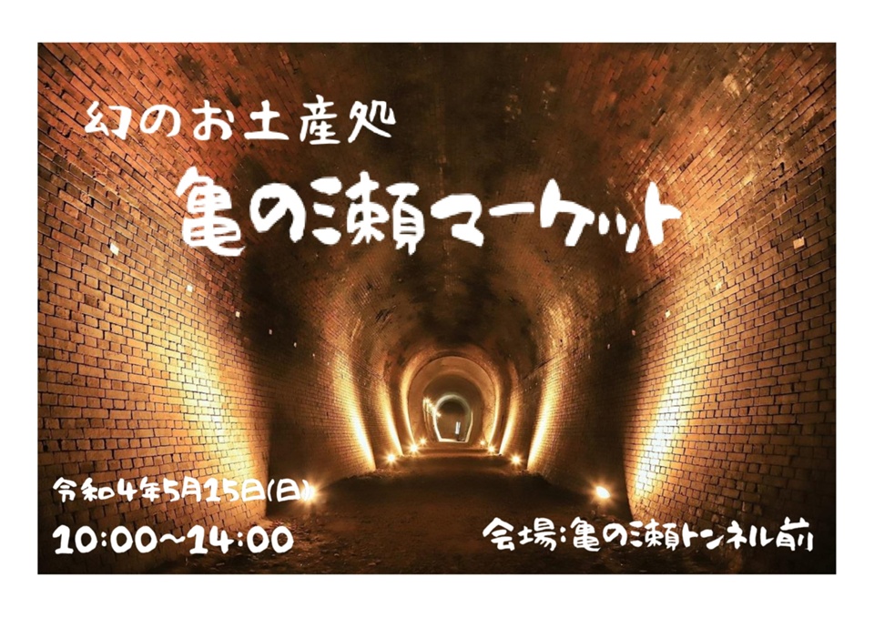日本遺産「亀の瀬・龍田古道」推進協議会が認定する日本遺産「もう、すべらせない!!」ブランドの商品を取り扱う店舗が1日限定で”幻のお土産処「亀の瀬マーケット」”(通称:かめま)として、亀の瀬トンネル前に出現します。日本遺産ブランド認定商品をはじめ、各種お土産品を販売いたします。また当日は地すべりで崩落したと思われていた幻の”亀の瀬トンネル”も見学可能ですので、是非この機会にお立ち寄りください。