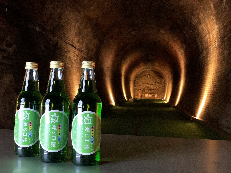 日本遺産「龍田古道・亀の瀬」推進協議会は、同日本遺産のPRの一環として、亀の瀬トンネル(旧大阪鉄道亀瀬隧道)内で貯蔵した炭酸飲料『亀の甲羅(コーラ)』をつくりました。