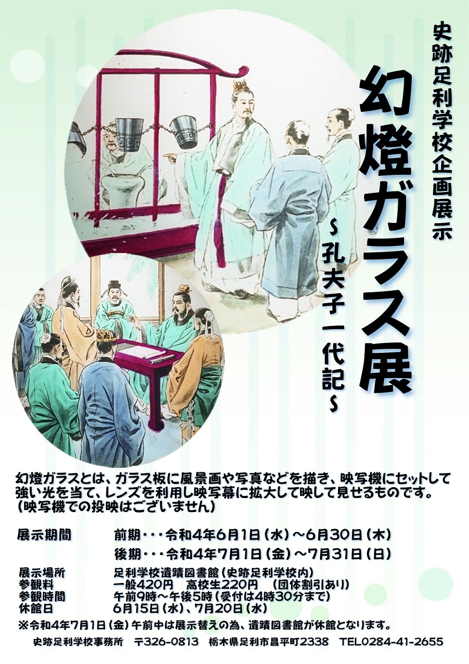 足利学校で所蔵する、幻燈ガラス版の「孔夫子一代記」と「孔子関連風景写真」及び、孔子の一生や当時の曲阜孔子廟、湯島聖堂等、貴重な資料を紹介します。