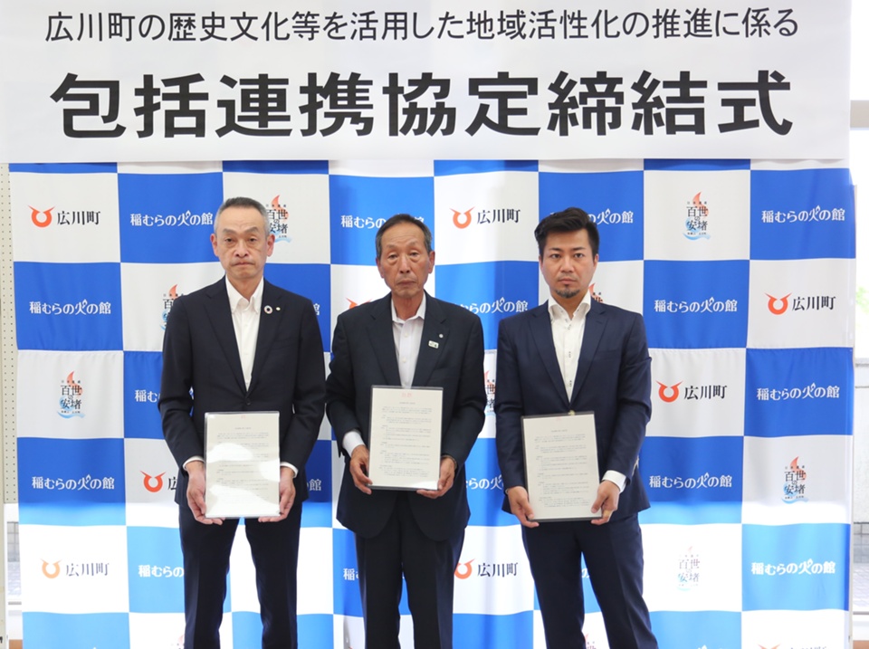 広川町における歴史文化などを活用し、観光振興や地域経済の活性化など地方創生に寄与する事業活動を連携して行うことを目的に、広川町は令和4年5月10日、株式会社紀陽銀行、株式会社つぎと(大阪府貝塚市)と「和歌山県広川町の歴史文化を利用した地域活性化の推進に係る包括連携協定」を締結しました。