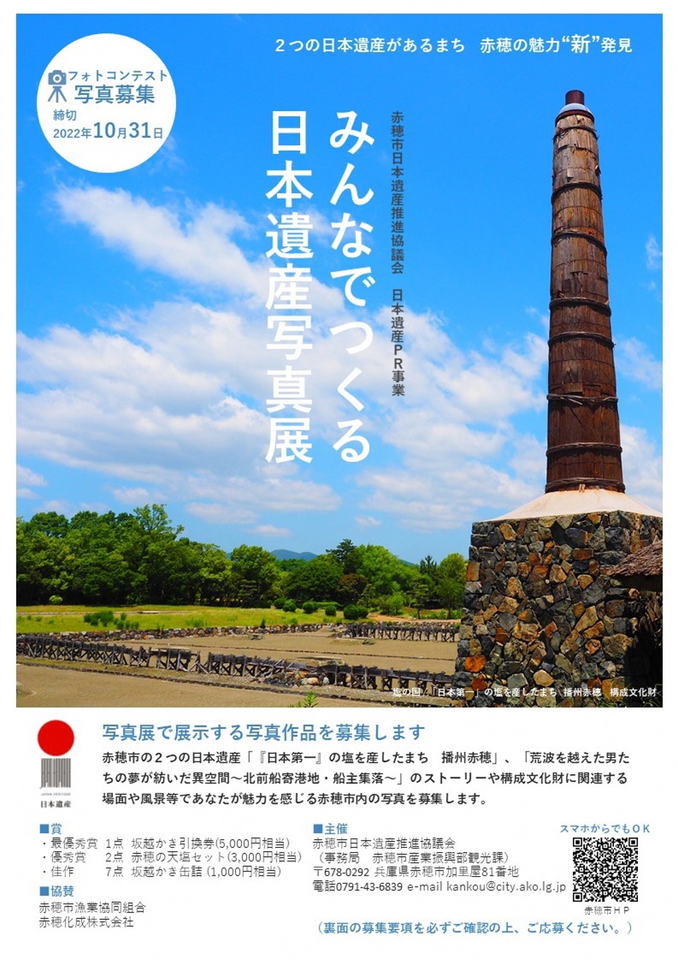 応募写真展「みんなでつくる日本遺産写真展~2つの日本遺産があるまち 赤穂の魅力‟新”発見~」の開催にあたり、赤穂市の2つの日本遺産「『日本第一』の塩を産したまち 播州赤穂」、「荒波を超えた男たちの夢が紡いだ異空間~北前船寄港地・船主集落~」のストーリーや構成文化財に関連する場面や風景等で、あなたが魅力を感じる赤穂市内の写真を募集しています。(応募締切:2022年10月31日)