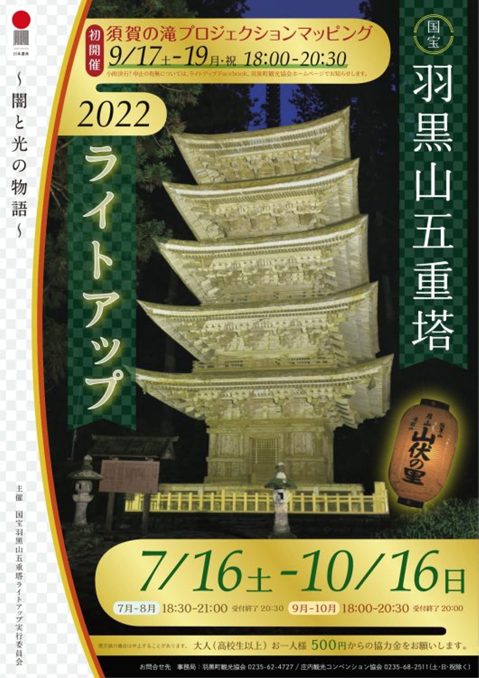 現在羽黒山では、10月16日までの土曜・日曜・祝日に五重塔ライトアップを開催中。