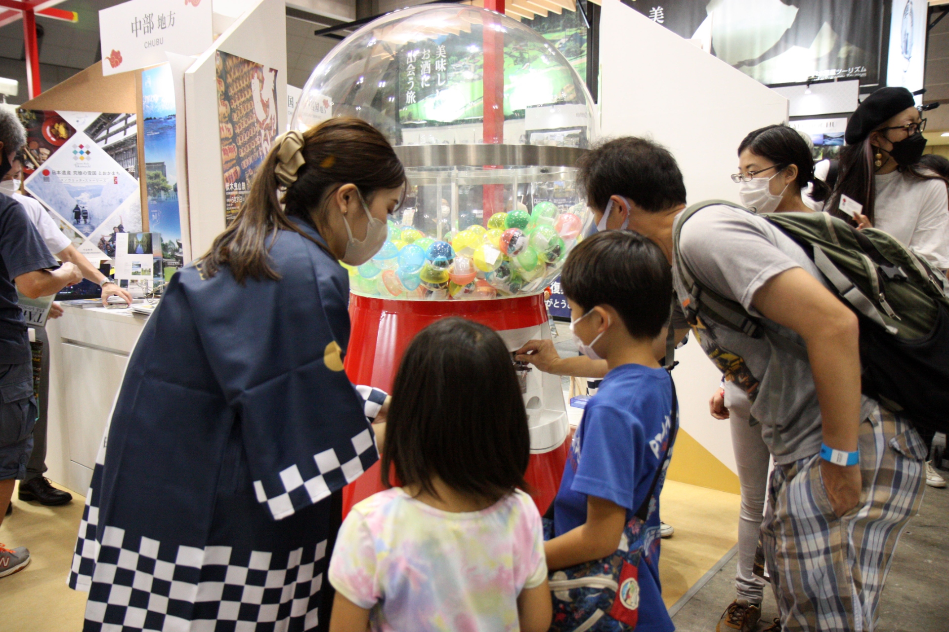 お楽しみとして用意した記念品のカプセルトイマシーンにも行列は途切れず、家族連れからグループまで参加し、日本遺産のロゴがプリントされたクリアファイルやトートバックなどを引き当てていました。