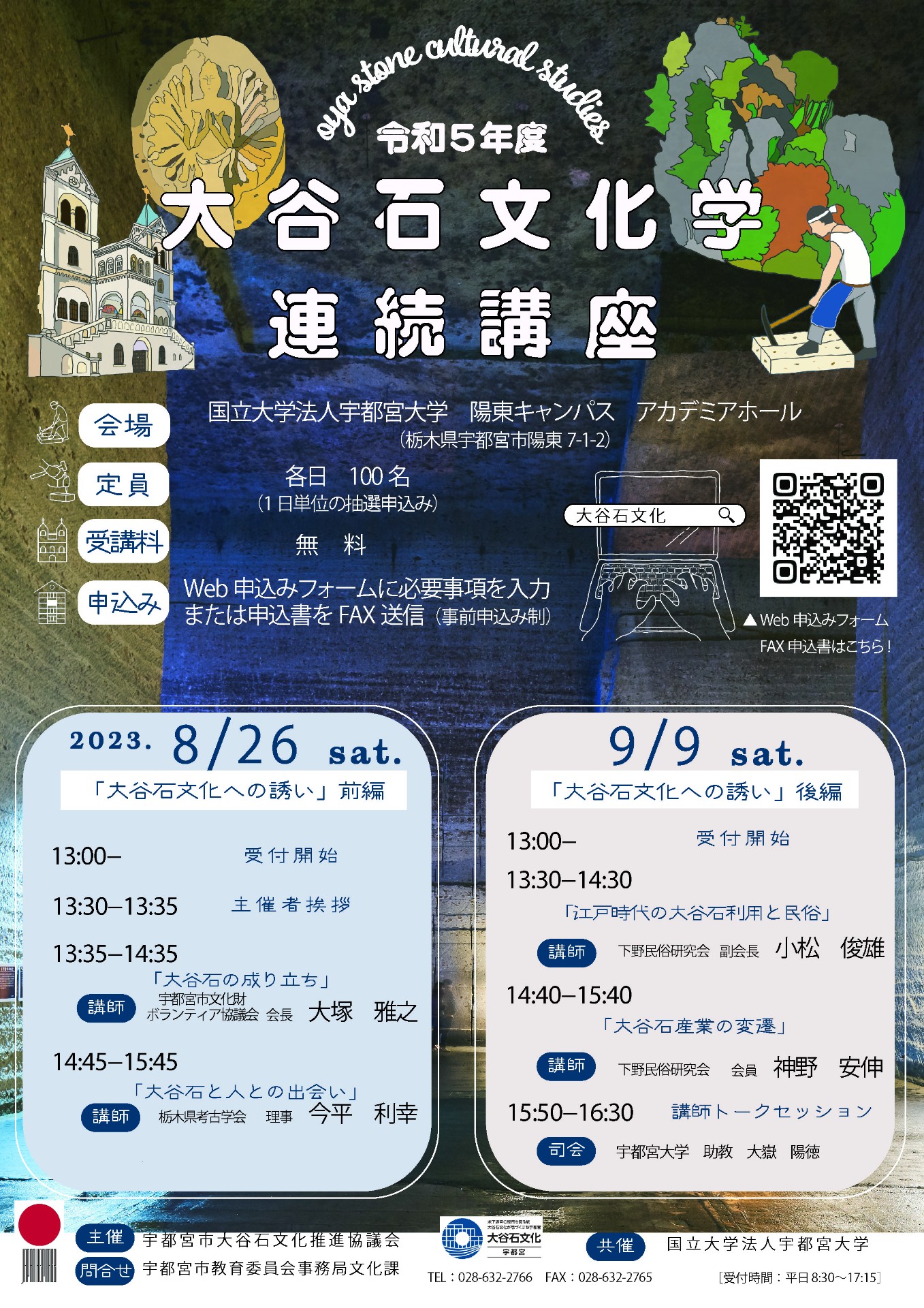 この連続講座は日本遺産であるとともに、私たちの郷土の遺産である「大谷石文化」を、学びを通じて身近なものとすることを目的として企画しました。今回の講座は3月に発行した「大谷石文化への誘い―その魅力と歴史を探る―」の執筆者たちによるもので、本を購入された方も、されていない方も楽しめる内容となっています。ぜひご参加ください。