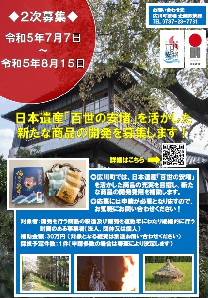 広川町では、日本遺産「百世の安堵」を活かした新たな商品開発に対して、下記のとおり補助事業を実施します。