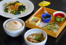 谷地八幡宮は「山寺と紅花」の構成文化財でもあり、谷地八幡宮神職林家により一子相伝で伝承されている「林家舞楽」では紅花染め衣装が用いられています。その谷地八幡宮で林さんにツアーをご案内いただけるなんて!まさに「山寺と紅花」のストーリーを感じられるツアーとなりました。食事もツアーを開催した河北町内の「まる梅」さんで、自家栽培の紅花やお野菜を中心としたおいしい朝食をご用意していただき、参加者のみなさんに「食と紅花」も体験していただくことができました!