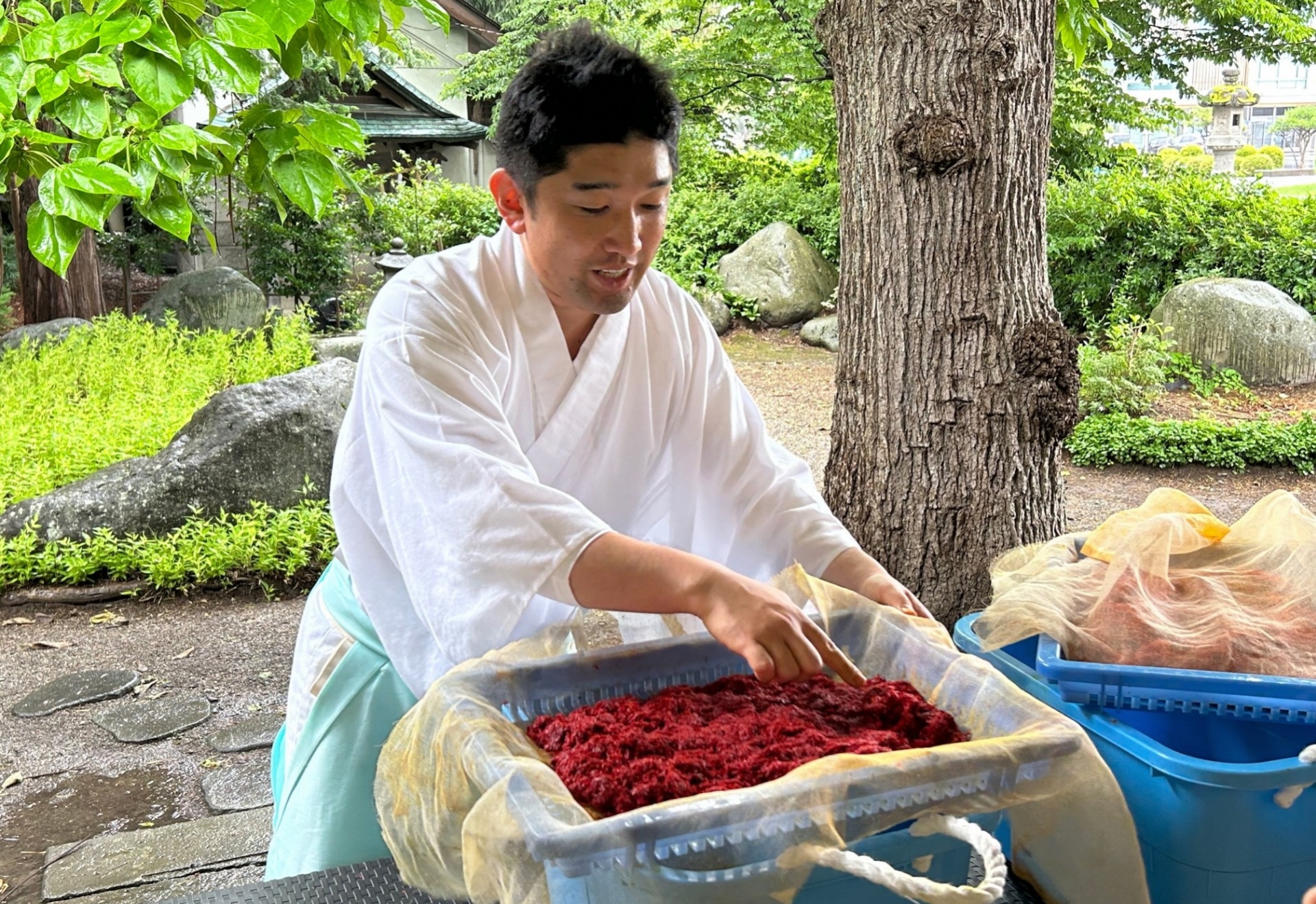 早朝から紅花摘みをし、(もちろん色は落ちますが)手を黄色に染めながら紅餅を作るツアー。でも朝早くからの作業だからこそ、普段感じないしんとした空気の中、鳥の声が良く聞こえる、少しずつ気温が上がってくるのが分かる、作業後の朝ごはんが更においしい。素手で紅餅を作るからこそ、少し時間をおいても摘んだ紅花がふわっとして温かいことや、寝せた後の紅花の粘り気のある感覚が分かる。
