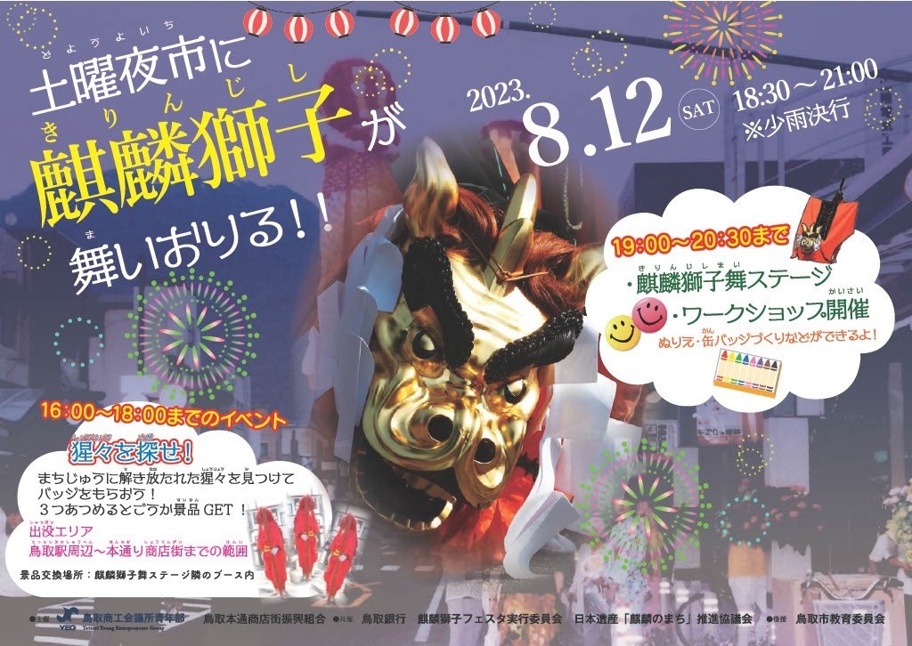 鳥取市の鳥取本通商店街で行われている土曜夜市。最終日となる8月12日は、「土曜夜市に麒麟獅子が舞いおりる!!」と題し、麒麟獅子舞の披露や缶バッジづくりワークショップの実施など、日本遺産・麒麟獅子舞のPRを行います。一度に4頭が舞う四頭舞の披露も! また、同日夕方にはまちに解き放たれた猩々を探すイベント<猩々を探せ!>も開催! ぜひお越しください!