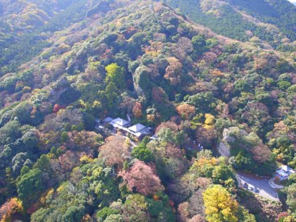 かつて「大魔所(だいましょ)」と呼ばれた岩峰の風景。山頂の高城からの眺望は標高300メートルとは思えない絶景です(左写真)。ここ一帯を修行場とした霊仙寺には鬼会面が残されています。