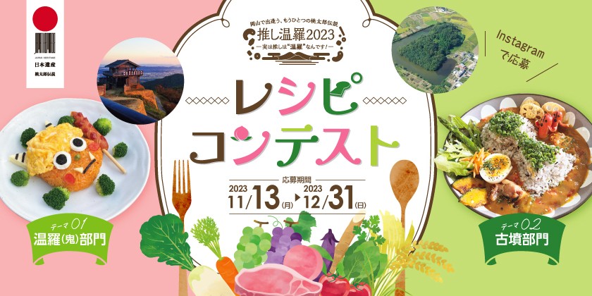食を通して、日本遺産「「桃太郎伝説」の生まれたまち おかやま」を身近に感じていただくため、"温羅(鬼)"と"古墳"をテーマにしたレシピを募集します。