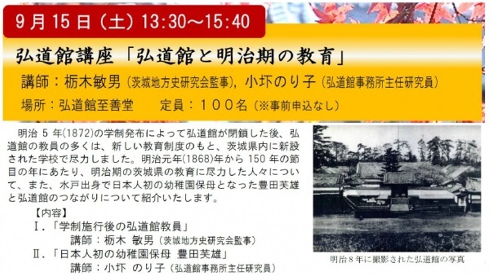 明治5年(1872)の学制発布によって弘道館が閉鎖した後、弘道館の教員の多くは、新しい教育制度のもと、茨城県内に新設された学校で尽力しました。明治元年(1868)年から150年の節目の年にあたり、明治期の茨城県の教育に尽力した人々について、また、水戸出身で日本人初の幼稚園保母となった豊田芙雄と弘道館のつながりについて紹介いたします。
