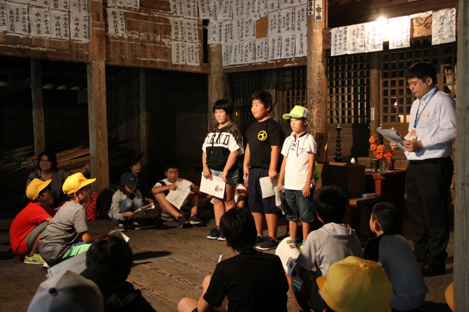 児童達は夏休みを利用して、日本遺産や校区の構成文化財について詳しく勉強しており、天念寺修正鬼会・真木大堂・中山仙境・春日神社について、調べた内容を発表してくれました。