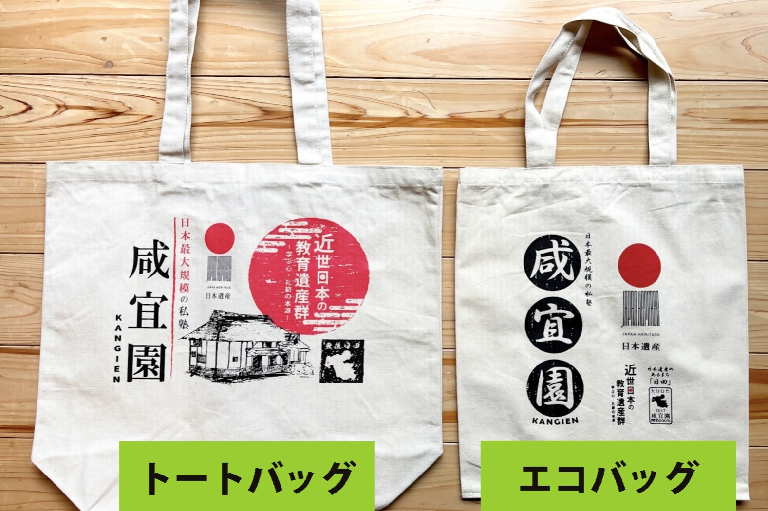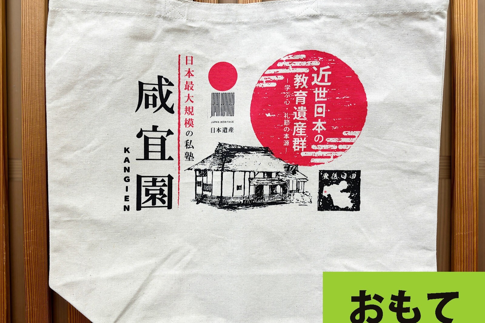 日本遺産第1号「近世日本の教育遺産群-学ぶ心・礼節の本源ー」の構成文化財であり、近世日本最大規模の私塾である「咸宜園」をもっと多くの方に知っていただくために、「日本遺産・咸宜園トートバッグ」を製作しました。従来から販売している咸宜園エコバッグより、ひとまわり大きいサイズのトートバッグです。