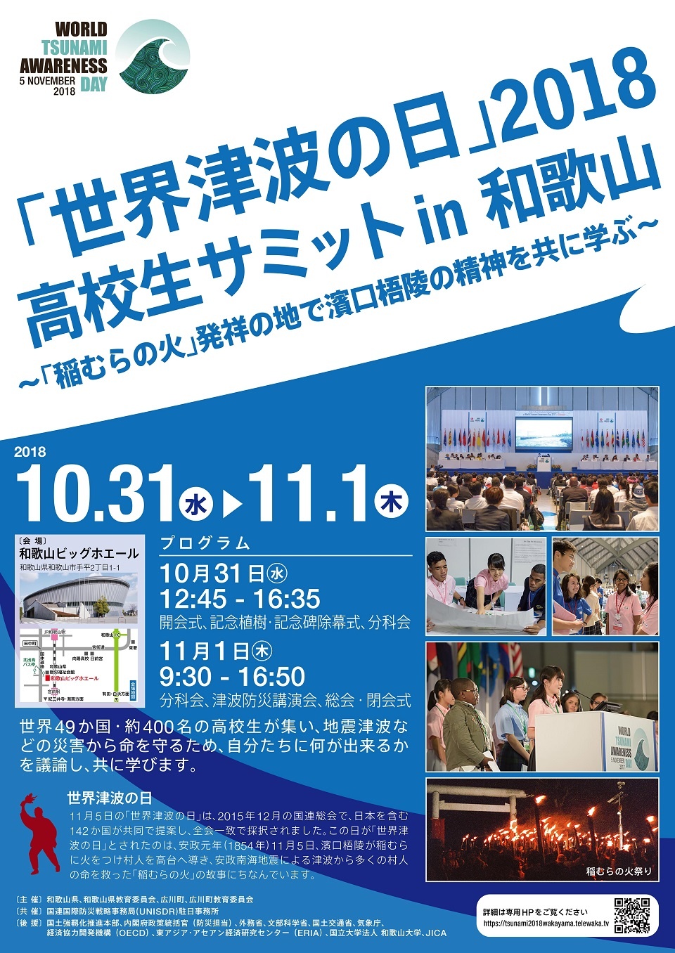 世界48か国の高校生250名と国内高校生135名が和歌山に集い、防災分野における将来のリーダーを育成し、災害から世界中の人々の命を守ることを目的に「世界津波の日」2018高校生サミット in 和歌山が以下の日程で開催されます。