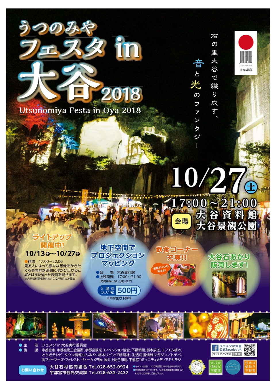 「石の里・大谷」は旧帝国ホテルの建材として一躍有名になった「大谷石」の産地であり、その類まれな景観が素晴らしく、御止山(おとめやま)、越路岩(こしじいわ)は国の名勝にも指定されています。この御止山を間近で見られる大谷景観公園や大谷石採掘場跡を見学できる大谷資料館を会場に、「石の里大谷で織り成す、音と光のファンタジー」をテーマにして、「フェスタin大谷2018」を開催いたします。