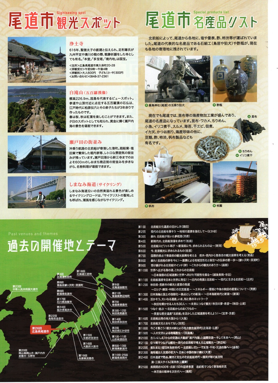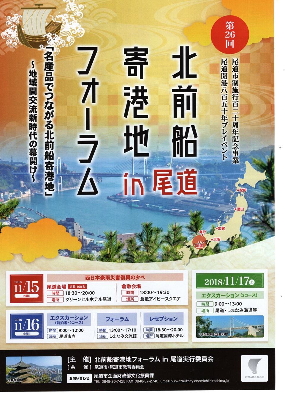 このたび、日本遺産「北前船寄港地」の追加認定及び開港850年プレイベントとして、「北前船寄港地フォーラムin尾道」を開催します。北前船寄港地フォーラムは、全国に散らばる北前船寄港地の地域間交流や地域活性化、観光振興を目的としてフォーラムです。26回目となる今回は、来年開港850年となる歴史ある港町尾道で、「名産品でつながる北前船寄港地~地域間交流新時代の幕開け」というテーマで開催します。16日のフォーラムは事前申し込み不要、入場無料、そのほかの復興の夕べ、エクスカーション、レセプションは申し込み必要、参加料がかかります。