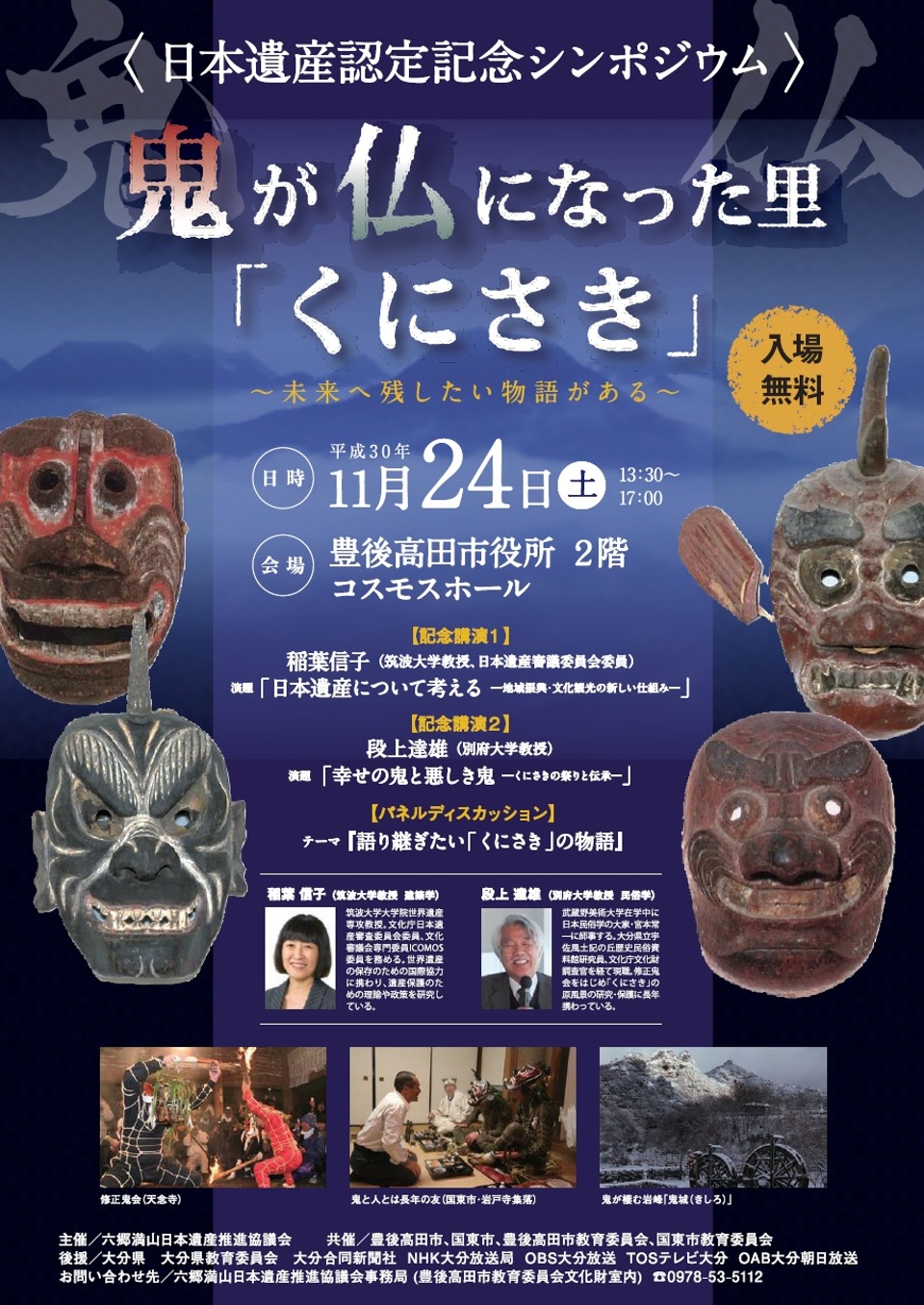 認定記念のシンポジウムでは、日本遺産審査委員会の稲葉信子先生、修正鬼会の研究をを長年されている段上達雄先生(民俗学)による記念講演や、日本遺産を活用して地域を盛り上げるためのパネルディスカッションを開催します。
