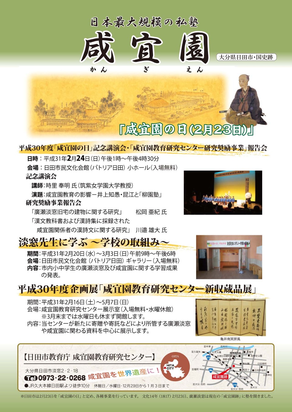 平成31年2月24日(日)、パトリア日田(小ホール)にて『平成30年度「咸宜園の日」記念講演会・「咸宜園教育研究センター研究奨励事業」報告会』が開催されます!