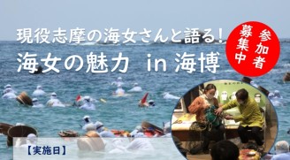 現役海女の話を聞ける催し「海女の魅力in海博」を開催します。 現役の志摩市内の海女さんをお迎えし、海女漁の実態についてお聞きします。 海女さんに逢えて、質問もできるチャンスです。ぜひご参加ください! 実施日 令和4年10月15日(土)志島の海女 10月22日(土)安乗の海女 10月29日(土)波切の海女 11月5日(土)船越の海女 11月12日(土)越賀の海女 11月19日(土)片田の海女 【時間】13時集合、15時終了予定 【参加費】800円(入館料・ところてんチケット付) 【定員】各日10名(要予約) 【場所】鳥羽市立海の博物館(三重県鳥羽市浦村町大吉1731-68) 【予約・お問い合わせ】海の博物館(℡)0599-32-6006 (Fax)0599-32-5581