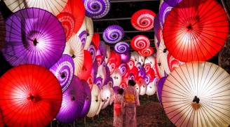 和傘の一本一本が、雅な明かりを放ち、大山寺参道をやさしく浮かび上がらせます。