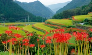 熊本県一の彼岸花の名所で、菊池川流域日本遺産構成文化財である「番所の棚田」。黄金色の稲穂と真っ赤な彼岸花のコントラストを楽しめるのは今しかありません!ぜひこの地域でしか見られない風景をお楽しみください♪