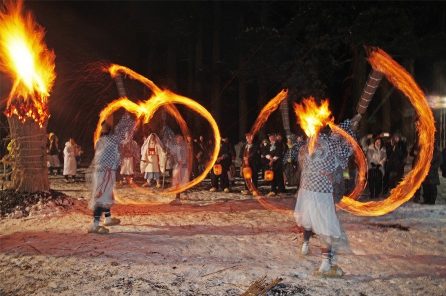 大晦日に行われる「松例祭」は、冬の峰を終えた山伏2人の集大成となる祭り。どちらの験力が優れているかを競う神事が行われます。