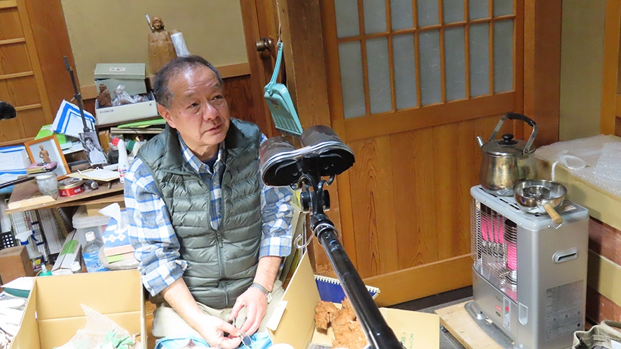 元田木山 一刀彫工房を主宰する元田木山(げんだぼくざん)さんは、一位一刀彫の伝統工芸士であり、祭・屋台修理技術者であり、さらには伝統工芸とは趣の異なる彫刻作品で日展や日彫展への出品・受賞経験も豊富なアーティストでもあります。工房をお訪ねしたときには、春の高山祭12台の一つ、恵比須台を彩る彫刻の清掃・修理の作業中でした。