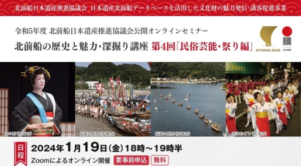 令和5年度北前船日本遺産推進協議会公開オンラインセミナー北前船の歴史と魅力・深堀り講座 第4回「民俗芸能・祭り編」のお申込みを開始いたしました。 日時:1月19日(金)18:00~19:30 毎回100名を超えるお申込みを頂戴しておりますオンラインセミナーもいよいよ最終回です。 ぜひみなさまご参加くださいませ。 以下のGoogleフォームまたはチラシのQRより、1月17日(水)までにお申込みください。 https://forms.gle/28LUjncy7iw33MTr9 ※当日のZoomID等は申し込み終了画面に掲載されます。 ※セミナー前日に、ご登録いただいたメールアドレス宛にメールをお送りいたしております。迷惑メールに分類されていることがあるようですので、届いていない場合にはそちらもご確認ください。