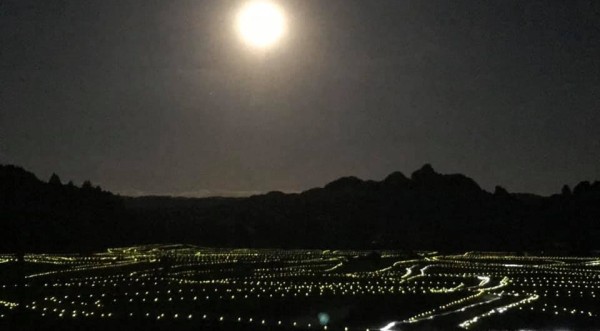 荘園時代から伝わる水田の形状を活かしたライトアップイベント。畦道に植えられたペットボタルが優しく点灯します。