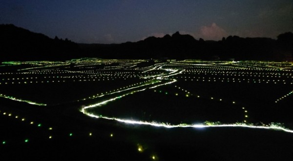 1万本のLEDライトを使用して重要文化的景観の水田の畦の形が、美しく浮かび上がります。