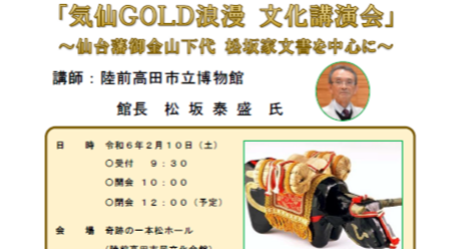 陸前高田市立博物館館長の松坂泰盛氏を講師に迎え、「『気仙GOLD浪漫文化講演会』~仙台藩御金山下代 松坂家文書を中心に~」というテーマで講演会を行います。
