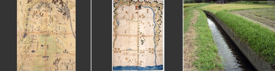 左:日根野村絵図(宮内庁書陵部所蔵)/中:日根野村・井原村絵図(宮内庁書陵部所蔵)/右:農地を潤す井川水路